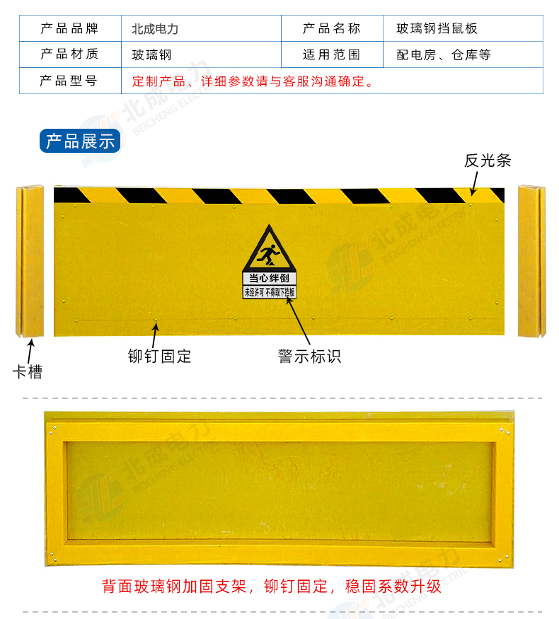 新型鋁合金材質擋鼠板替代老式擋鼠板材,實用、結實、耐用、使用時間長。由擋鼠板主板面和卡槽夠成,外觀可見部分為鋁合金定制,且貼有黃黑色的反光警示貼。
